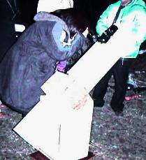 自宅で撮影した月のクレータのビデオと、教室いっぱいの布に書いた月を利用して表面の様子や大きさを把握。また、写真のようにまち針(月)を厚紙の先(25cm)に付けものを用意し目の前に置き、段ボールで作った太陽を100m離れた所に置いて同じ大きさに見えることも扱った。